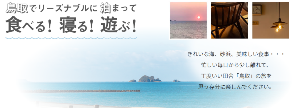 岩美郡浦富にあるリゾート型ペンションです。宿泊費がふるさと納税の対象になっています。全国屈指の水質を誇る浦富海岸まで徒歩5分の好立地で、磯遊びに最適な環境です。