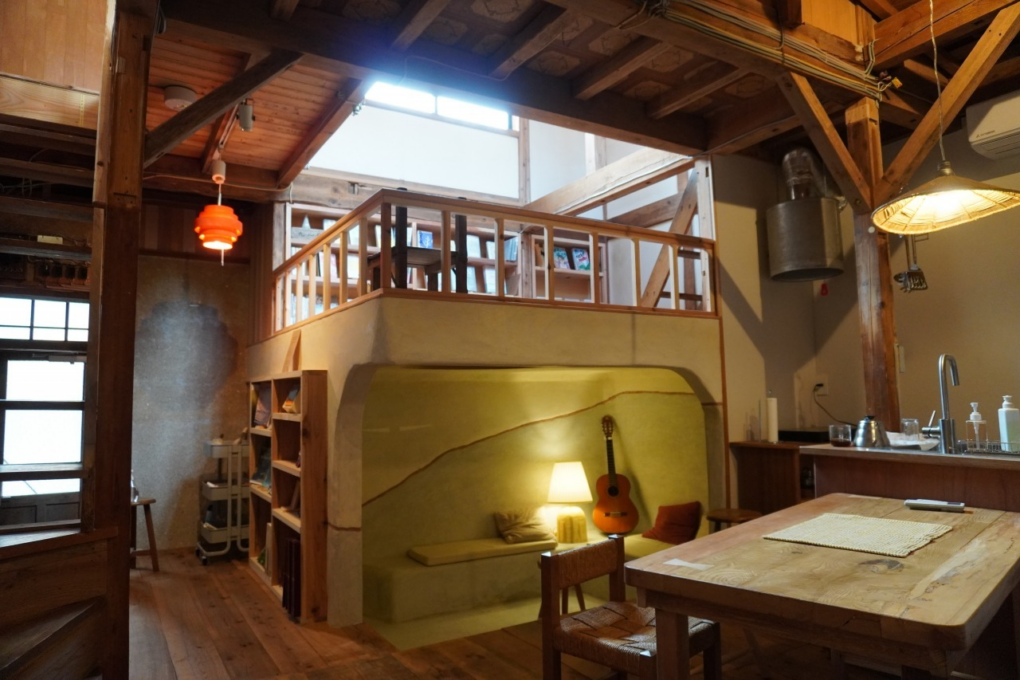 山陰本線浜村駅近くの一棟貸しのゲストハウスです。最大で6名まで宿泊できます。1階部分のロフト状になったリビングスペースが特徴的で、温泉街の宿に「あえて籠もる」ことをコンセプトにしています。