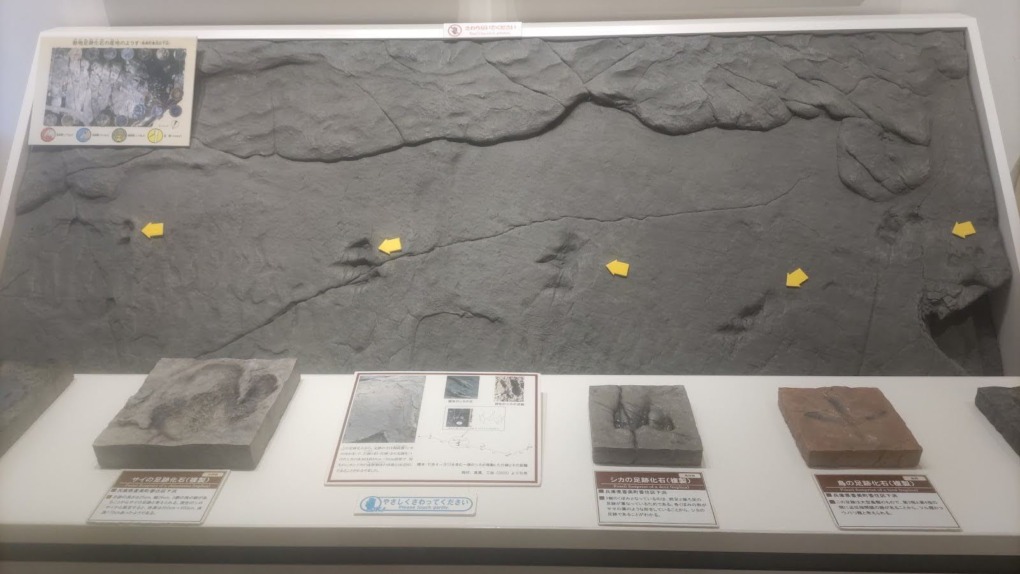 古代の生物の足跡が残された化石(レプリカ)や、「摂理」という自然現象で緻密な五角形に形成された岩石を見ることができます。岩石の標本の中には、手を触れられるものもあります。