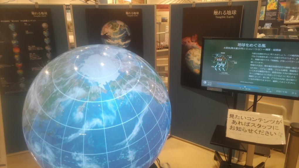 こちらはデジタル地球儀です。手で触れると、上下左右に画像が回転します。気象や気温についての観察も可能です。詳しい操作は、職員の方に質問してください。