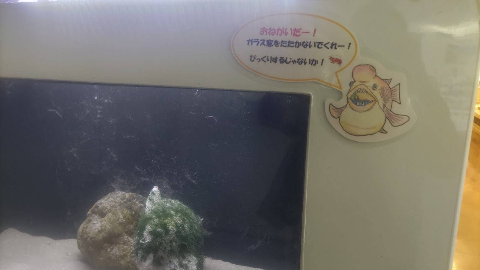 館内の水槽のいくつかに貼ってあったメッセージです。「水槽のガラス壁をたたかないでください」とのことです。小さな生き物は繊細なため、急な刺激は強いストレスになってしまうようでした。水槽の様子は、ぜひ静かに鑑賞するようにご注意ください。