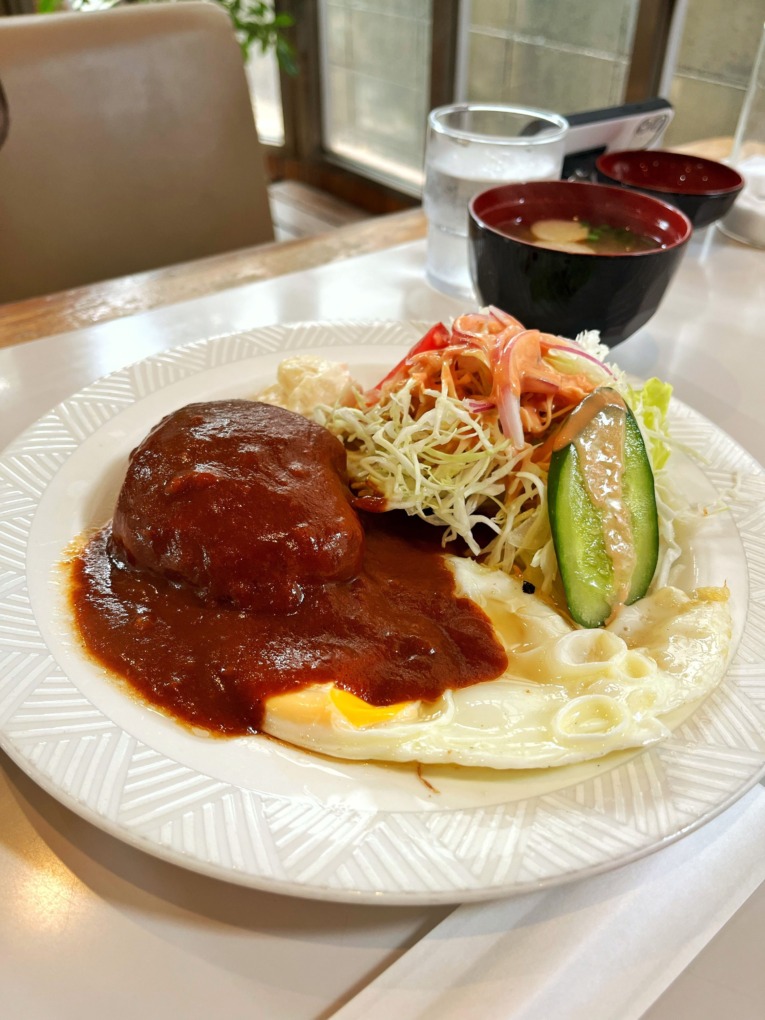 内容は、デミグラスソースがかかったハンバーグに、目玉焼き、サラダ、ライス、味噌汁が付いたボリューム満点のセット。