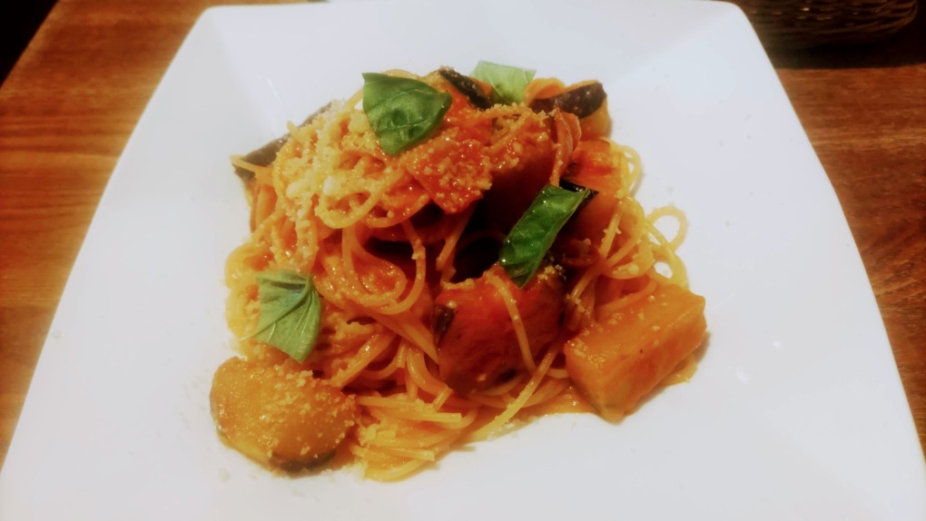 ナスはあらかじめ油で調理してあるのか塩気がしっかり効いており、とろりと柔らかな食感です。トマトソースは酸味が軽く、トマトの自然な甘みを感じました。
