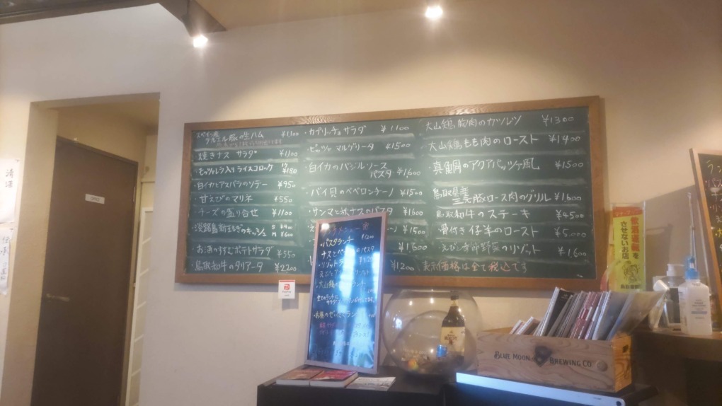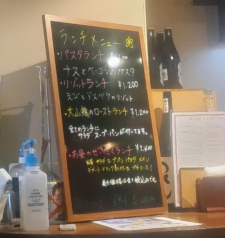 小さな黒板にランチメニューが書かれています。パスタランチとリゾットランチ、大山鶏のローストランチの他に、パスタとメインのついたランチコースがありました。