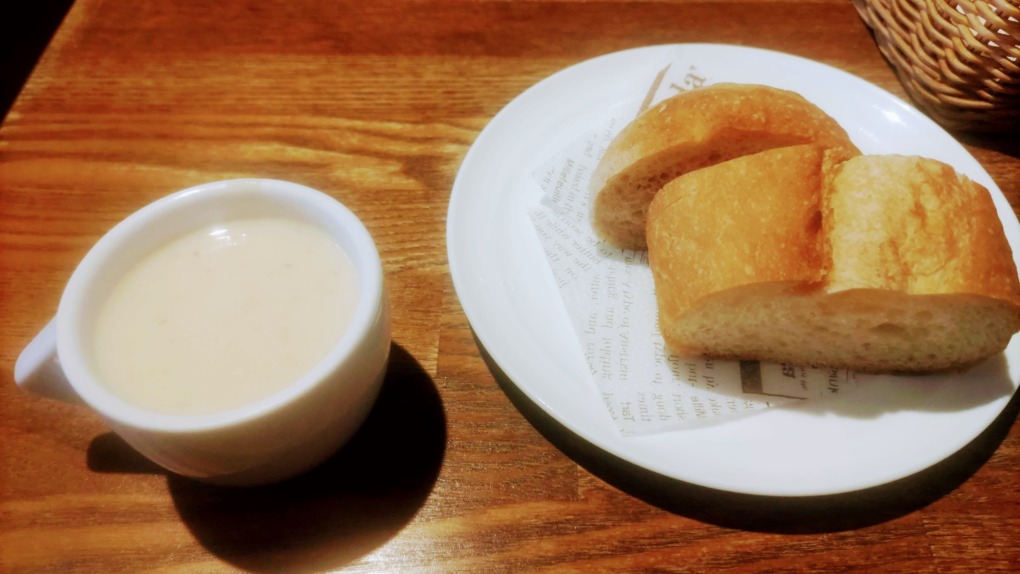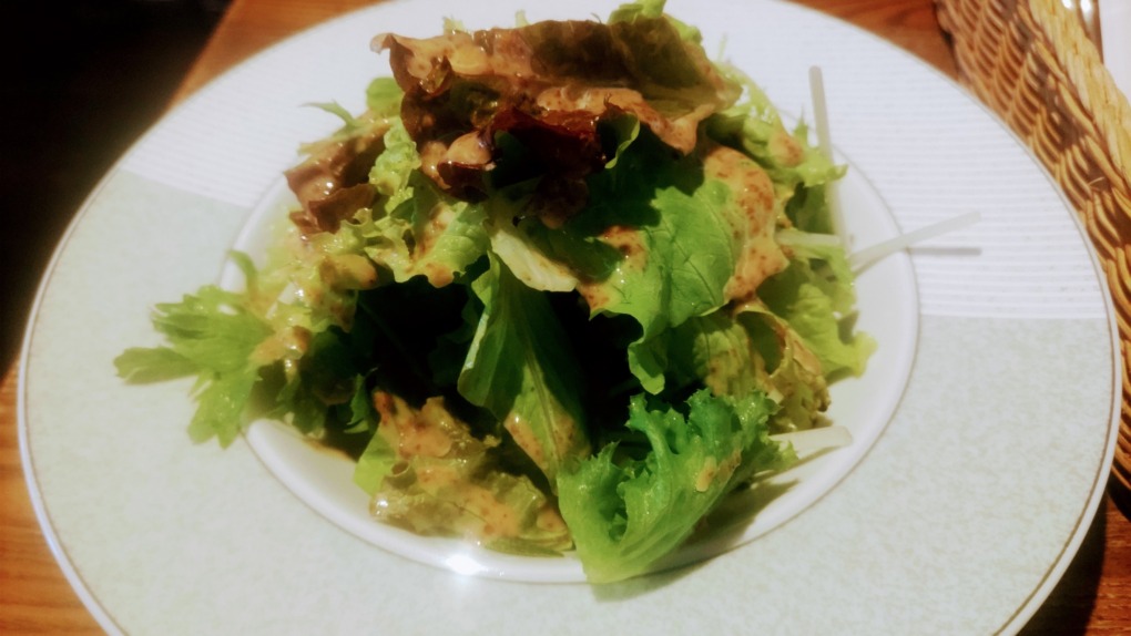 セットのグリーンサラダと、パンとスープです。ドレッシングはゴマ風味が濃く、あっさりとした葉野菜とのバランスがいいです。小さなカップに入った玉ねぎのスープはなめらかで旨味が深く、パンは温め直してふかふかな状態でサーブしていただきました。