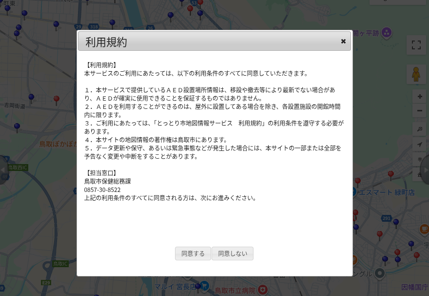 とっとり市地図情報サービスの「AED設置場所」を開くと、まずその注意書きが現れます。「同意する」をクリックして利用を開始してください。