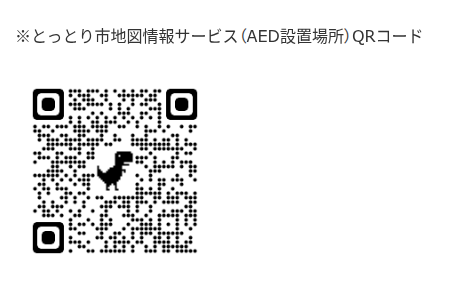 鳥取市ホームページの「防災・安全」のページから「AEDマップについて」というページに飛ぶと、AEDマップを表示するためのQRコードがあります。スマートフォンやタブレットのカメラで読み込むことで、とっとり市地図情報サービス内のAEDマップを開くことができます。詳しくはこちらのページを参考にしてください。
