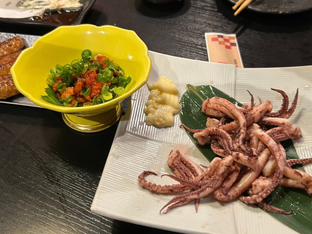 タコの唐揚げは揚げたての香ばしさと塩気がビールに最高で、イカゲソ塩焼きは香ばしい香りと噛むほどに広がる旨みでお酒が進む進む。えんがわチャンジャはピリッとした辛味とコリコリ食感があり、こちらもつまみに最適でした。