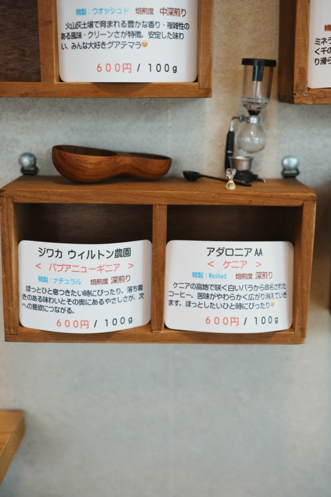 さらに、店内の棚には各国のコーヒー豆が小さなカードと一緒に展示されており、豆の産地や精製方法、味わいの特徴が丁寧に説明されています。
