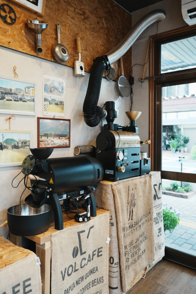 扉を開けると、木の温もりを感じる空間が広がります。壁には昔の街並みの写真や小物が飾られ、どこか懐かしく落ち着いた雰囲気。カウンター周りには焙煎機や豆の袋が並び、「ここで焙煎しているんだ」と実感できる臨場感があります。