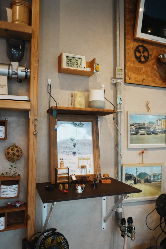 ちょっとしたミニチュアのコーヒー器具や雑貨もあり、遊び心が感じられるディスプレイ。小規模ながら温かみがあり、コーヒーに向き合う真摯な姿勢が伝わってきます。