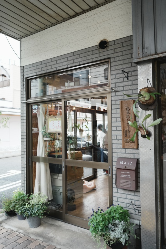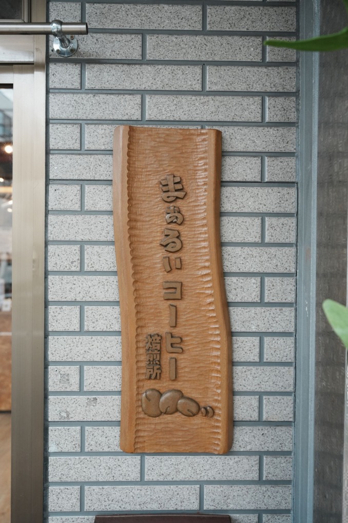 外観はガラス張りの扉から店内の様子が少し見え、木彫りの「まぁるいコーヒー」と刻まれた看板が目印。植物が飾られたエントランスが柔らかい雰囲気を演出し、初めて訪れても入りやすい空気をまとっています。