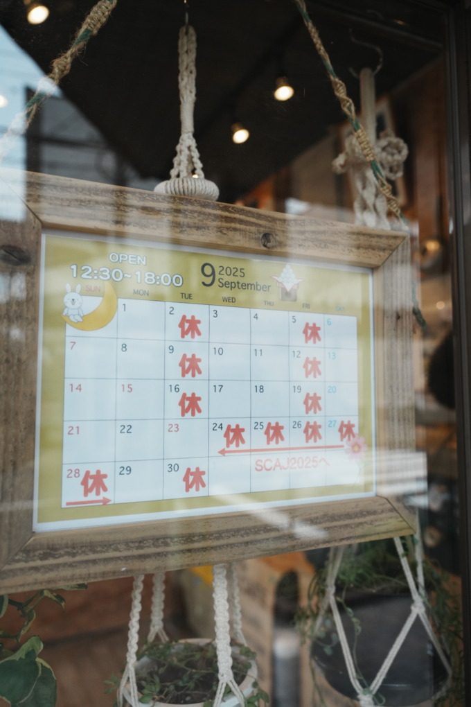 また、お店の外には営業カレンダーが掲示されており、営業日やイベント出店の予定もひと目で確認できます。焙煎所という特性上、一般的なカフェと比べて営業日が限られているので、訪問前にSNSや店頭のカレンダーでチェックしておくのがおすすめです。
