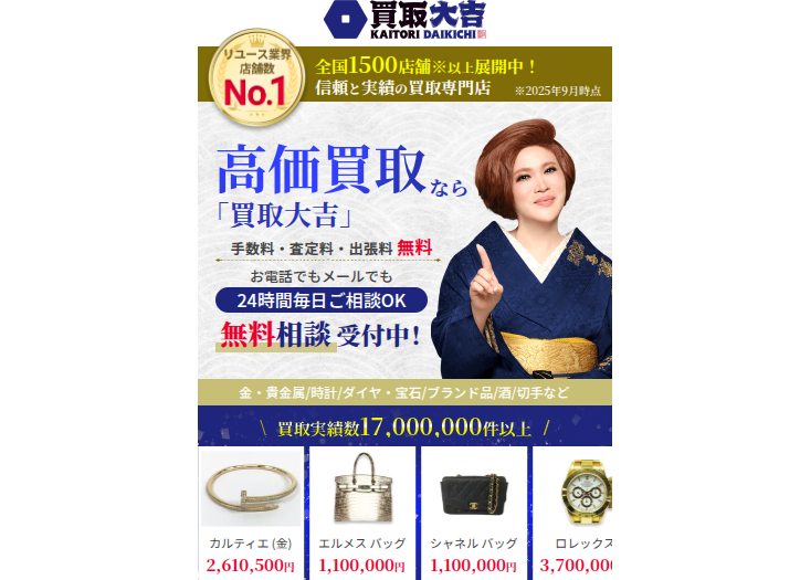 | 買取品目 | 貴金属、ブランド時計、ブランドバッグ、宝石 デジタル機器、オーディオ機器、アウトドアグッズ、商品券、ファストファッション他多数 |