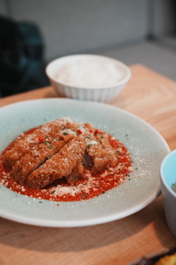 見た目はボリューミーながら、トマトソースの酸味とチーズのコクが相まって、最後まで飽きずに食べられます。ご飯やスープも付いており、定食感覚でしっかり満たされるセットでした。