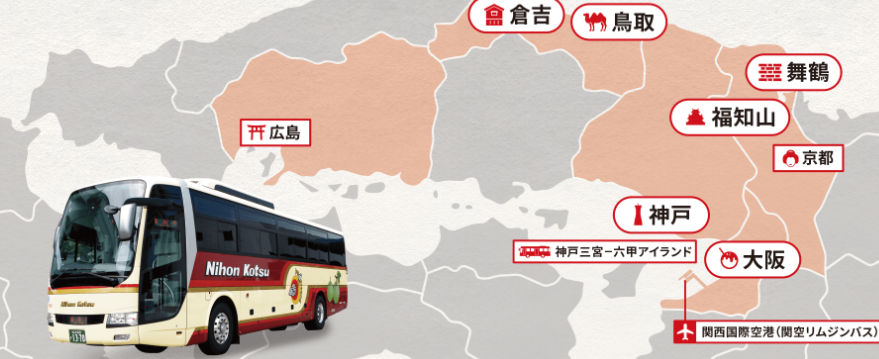 | 料金 | 日本交通 鳥取〜神戸・大阪線 鳥取駅発なんば着 4,200円 鳥取駅発大阪梅田着 4,200円 |