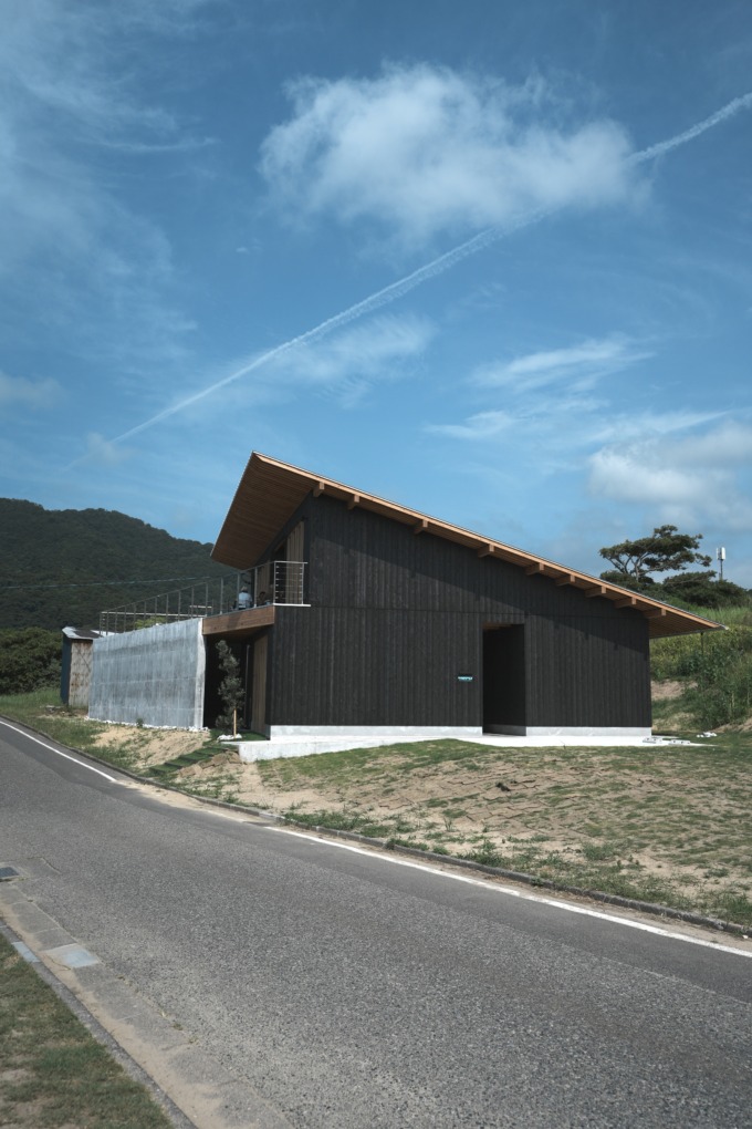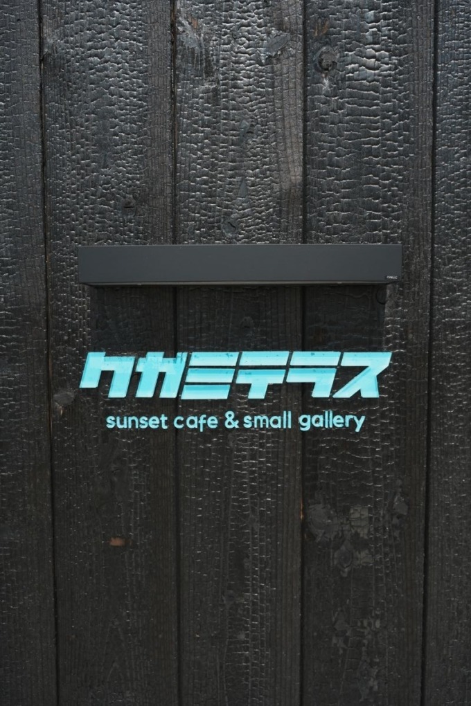 鳥取県岩美町の海沿いに佇む「クガミテラス」。真っ黒な焼杉板の外壁と木の温もりを感じる屋根が特徴的な建物で、ドライブ途中に現れるとつい立ち寄りたくなる存在感があります。