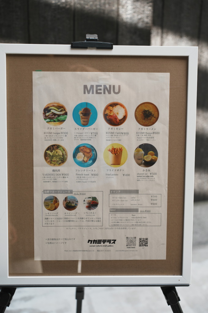 フードは「クガミバーガー(900円)」「焼肉丼(900円)」「クガミカレー(800円)」などしっかり食事ができるものから、「フレンチトースト(800円)」「フライドポテト(400円)」といった軽食まで揃っています。