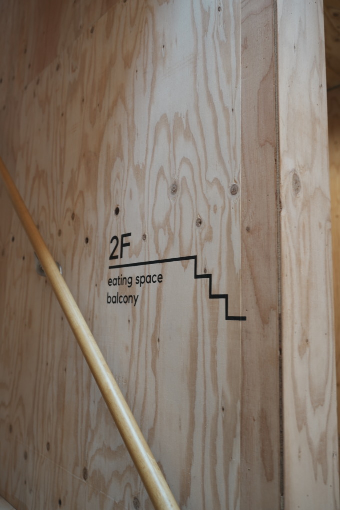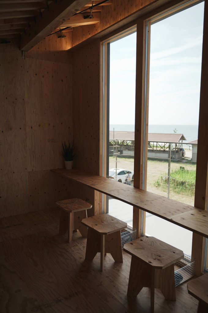 店内は木の板で統一されたシンプルでナチュラルな雰囲気。1階は注文カウンターと小さなギャラリースペース、2階に上がると大きな窓から海を見渡せるイートインスペースが広がっています。