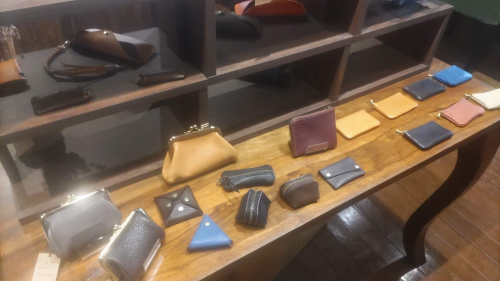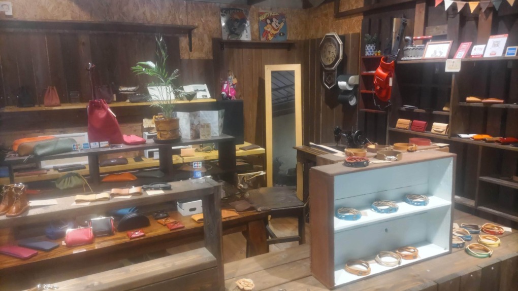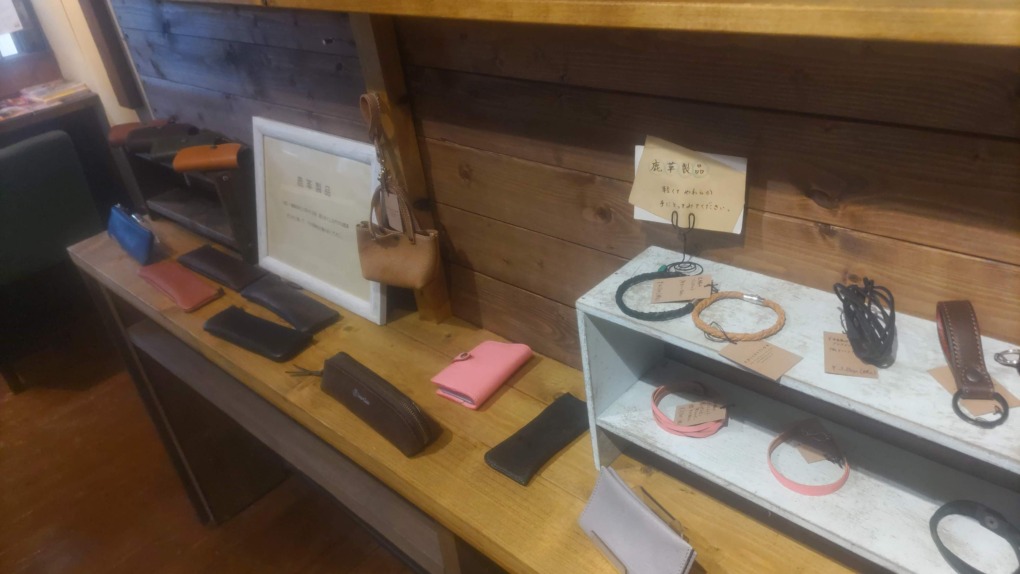 店内には、鹿革や牛革で制作されたアクセサリーやバッグ、小銭入れなどさまざまな商品が陳列されています。