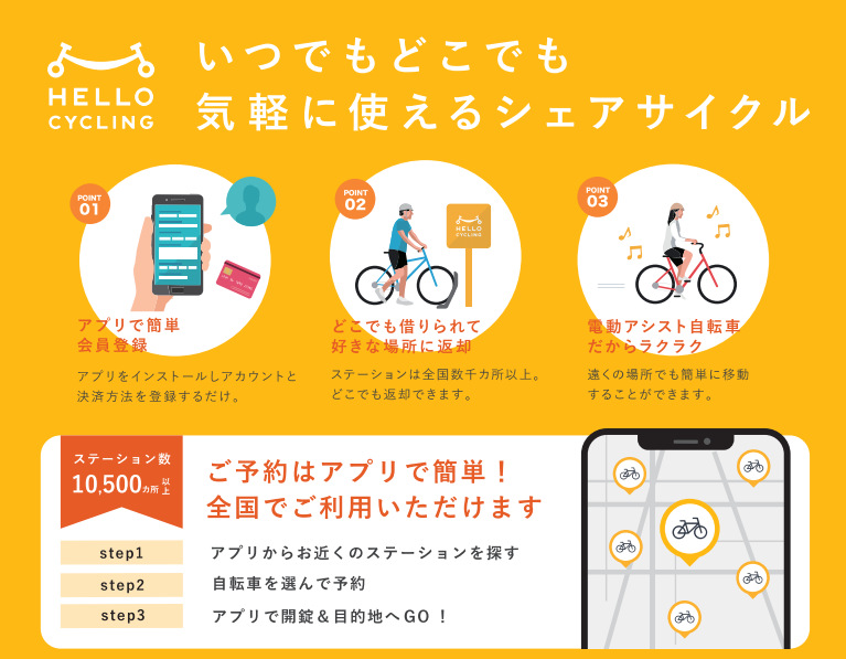 専用アプリを使って自転車をレンタルし、任意のステーションに返却した後、電子マネー決済などで料金を支払う仕組みです。