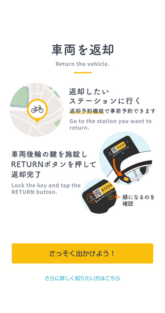 返却する場合は、ステーションに自転車をセットしたあとでアプリ画面上の「返却」をクリックすると再びロックがかかり、登録した電子決済からの金額が確定し、支払いが行われます。利用料金は30分150円で、それ以降は30分ごとに110円です。