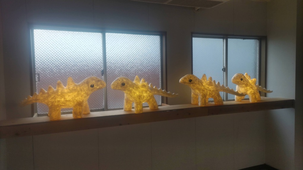 和紙の灯りが照らすほんのりと薄暗い空間と、雲竜紙の独特の質感、怪獣の子どもの不思議な優しいフォルムが、日常から離れた感覚を演出しています。