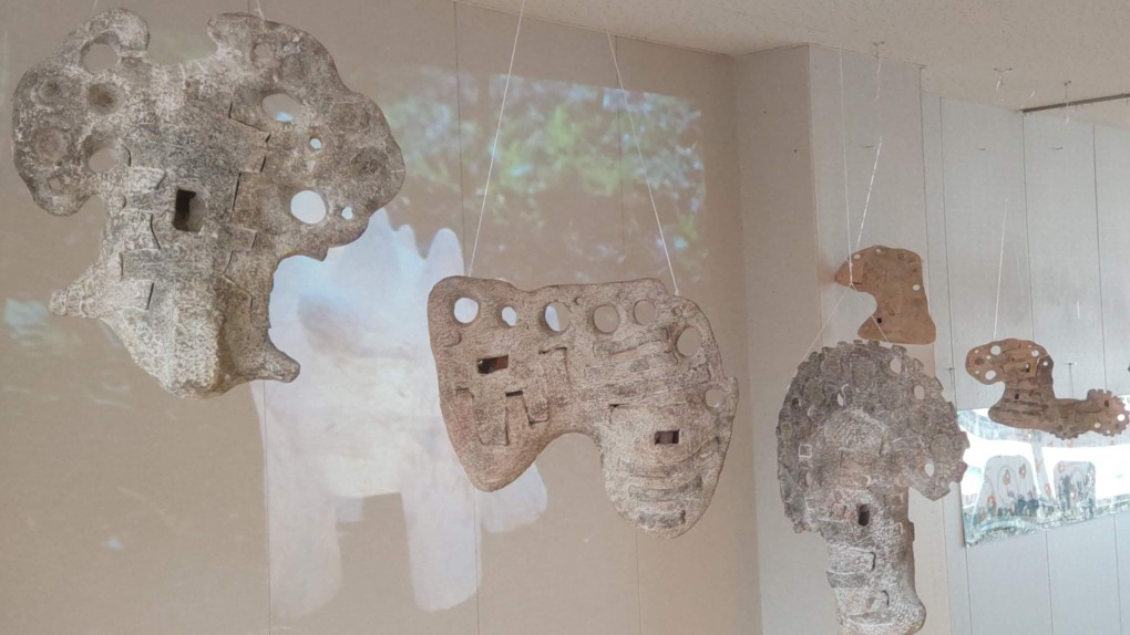 「雲竜紙」という繊維の粗い和紙で作られたオブジェと、テラコッタ(素焼き)の彫刻が一種のストーリーを描くように配置されています。