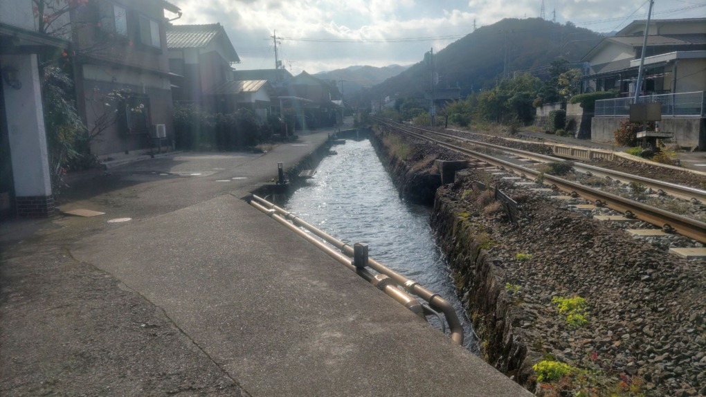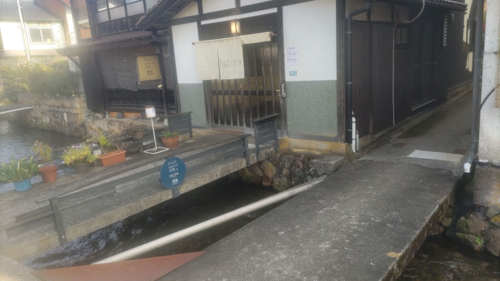 お店の前から近くの線路に沿って澄んだ水をたたえた小川が流れています。非常に透明度が高く、水底が透けて見えました。そここに小さな魚が泳いでいる様子も見られましたよ。