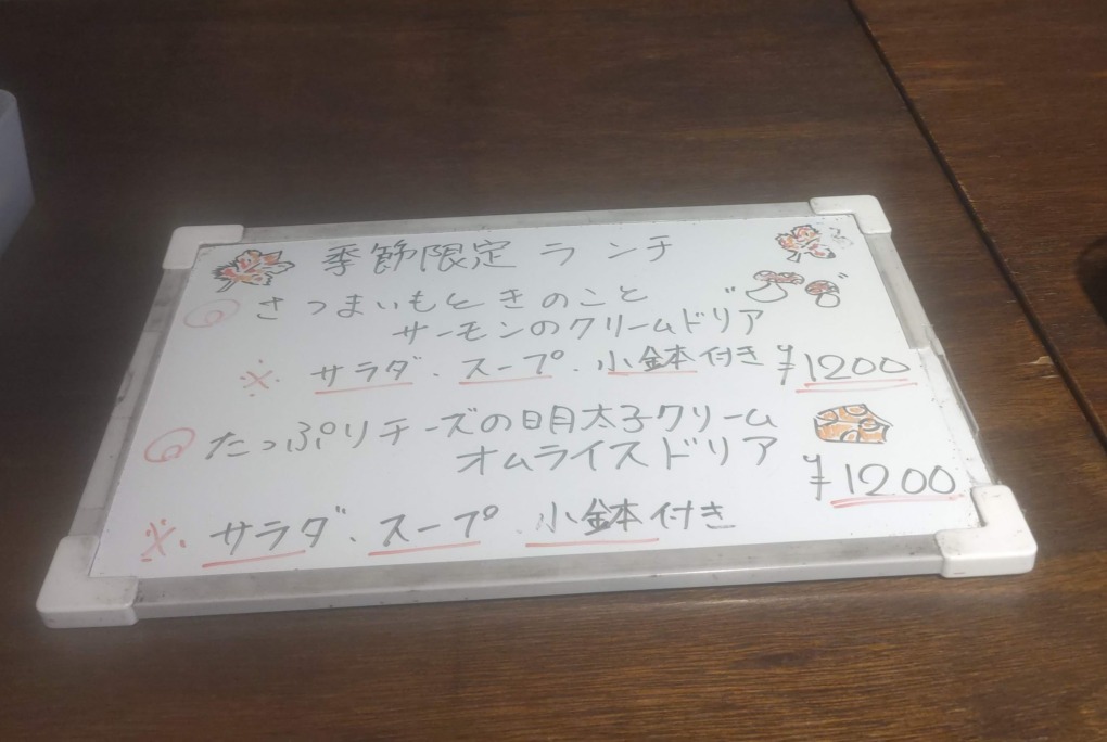 こちらは限定メニューです。伺ったのが11月だったので、秋らしくきのこやさつまいもを使ったものがありました。たっぷりチーズのオムライスドリアも温かそうで魅力的です。