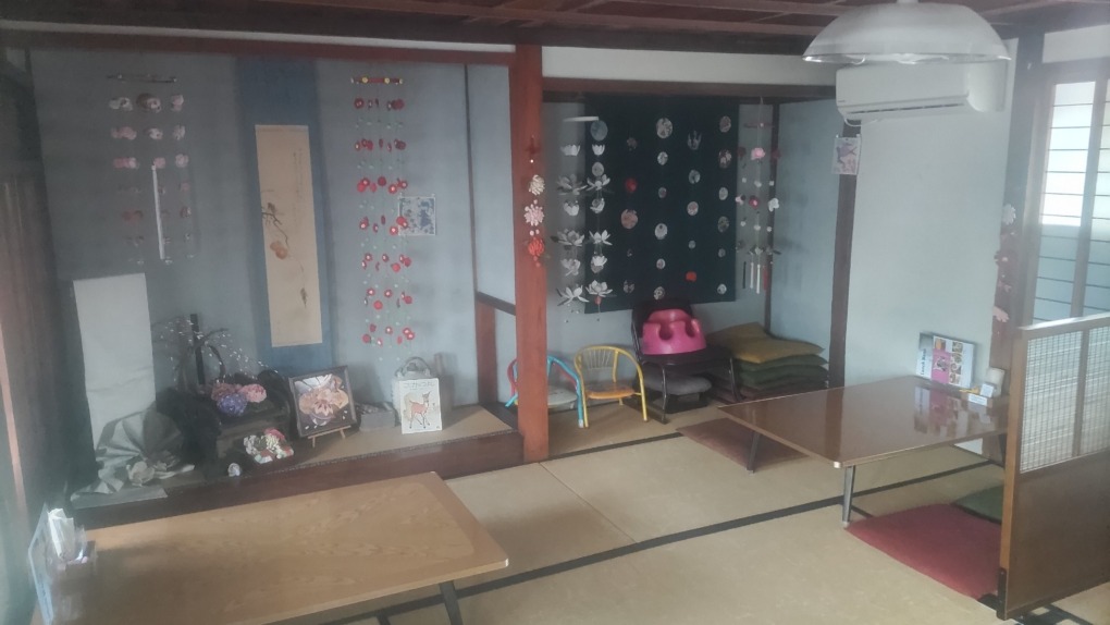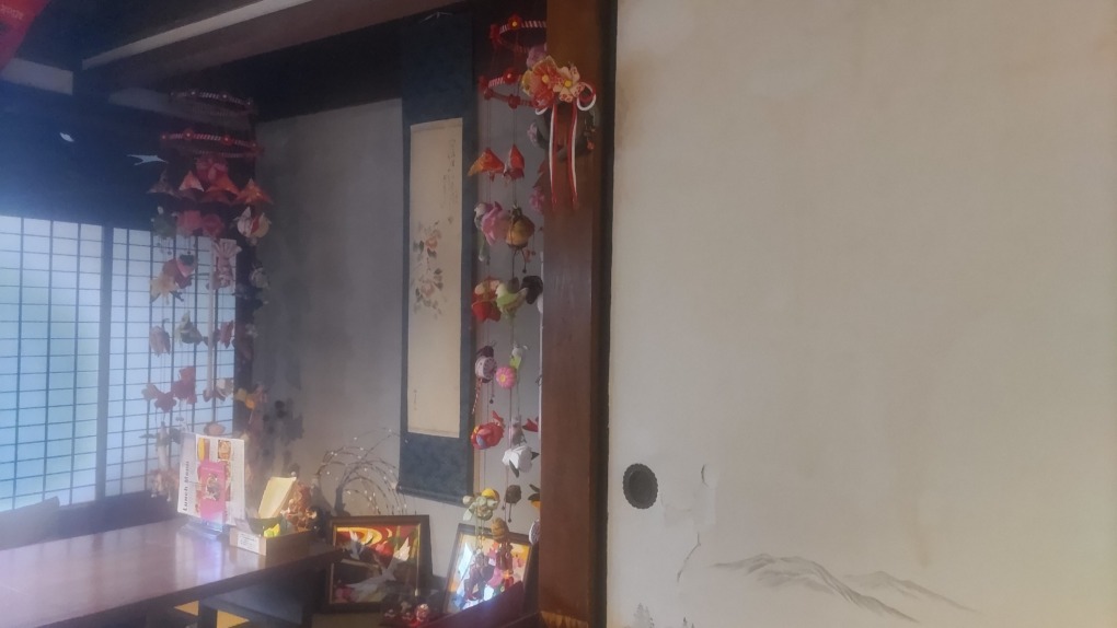 こちらは2階席です。畳に座卓の客席が4つほどありました。こちらにもつるし飾りがたくさん飾られていました。鑑賞だけの2階の利用も、お店の方に断れば可能でしたよ。