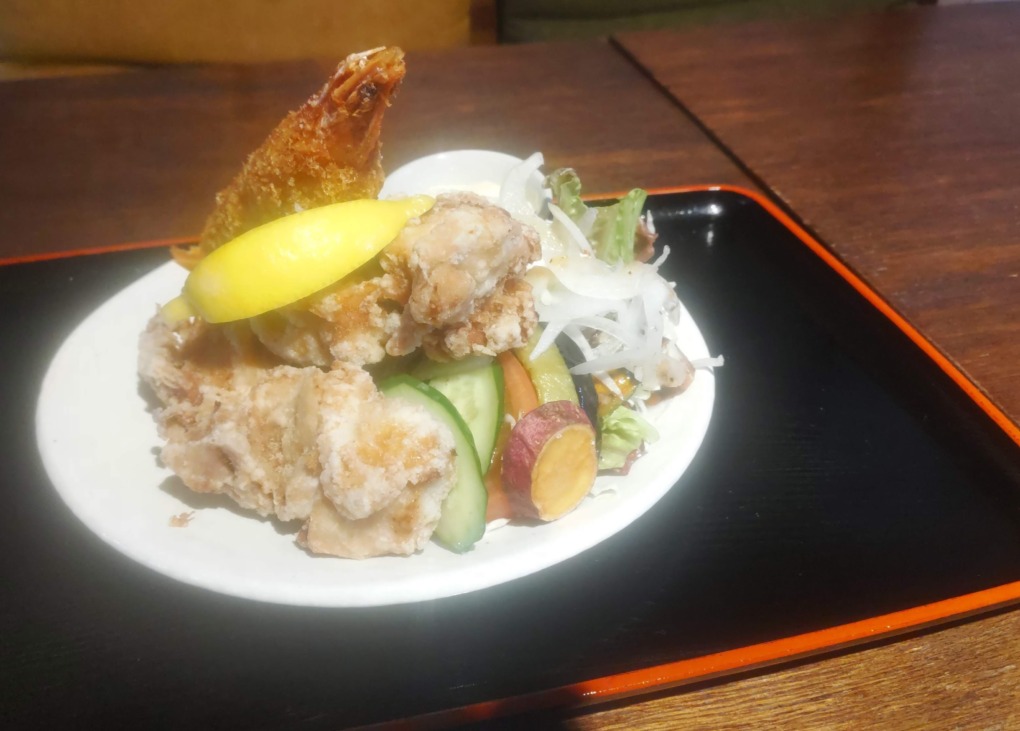 大きなエビフライとたっぷりの唐揚げに隠れて付け合せの野菜も充実していました。ナスは温かくとろりとジューシーで、さつまいもはほっこりと食べやすく調理されています。ドレッシングが少し香ばしくてあっさりしたサラダも美味しくいただけました。