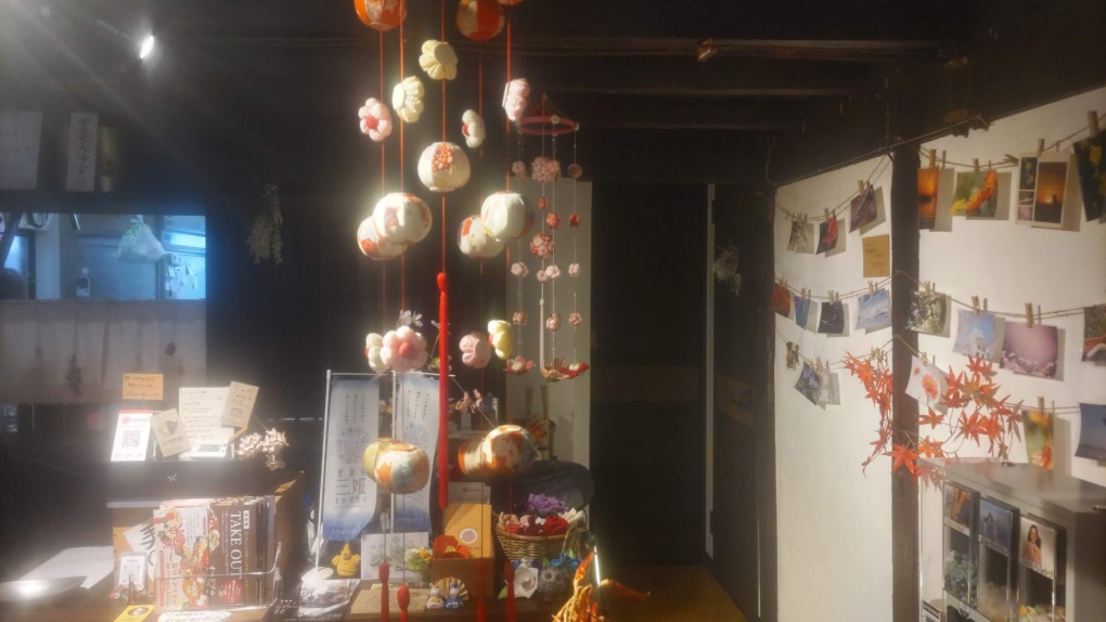 時間の経過とともに色合いが変化した名残が見える柱や窓枠に、最近作られた色鮮やかな布製のつるし飾りが不思議と調和して、独特な空間を演出しています。注文したものを待っている間に、ひとつひとつの飾りを眺めていると穏やかな時間が流れていくようでした。