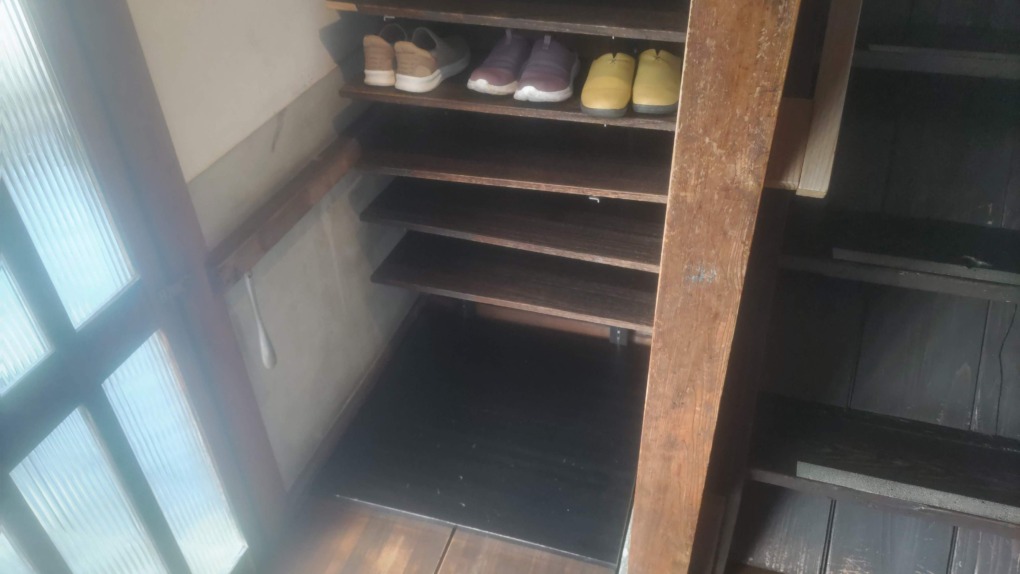 玄関で靴を脱いで店内に上がる仕組みです。入口よこの靴だなをお使いください。