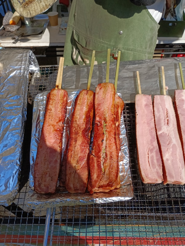 これは分厚いベーコンを炭火で焼いた食べ応え満点の1本です。