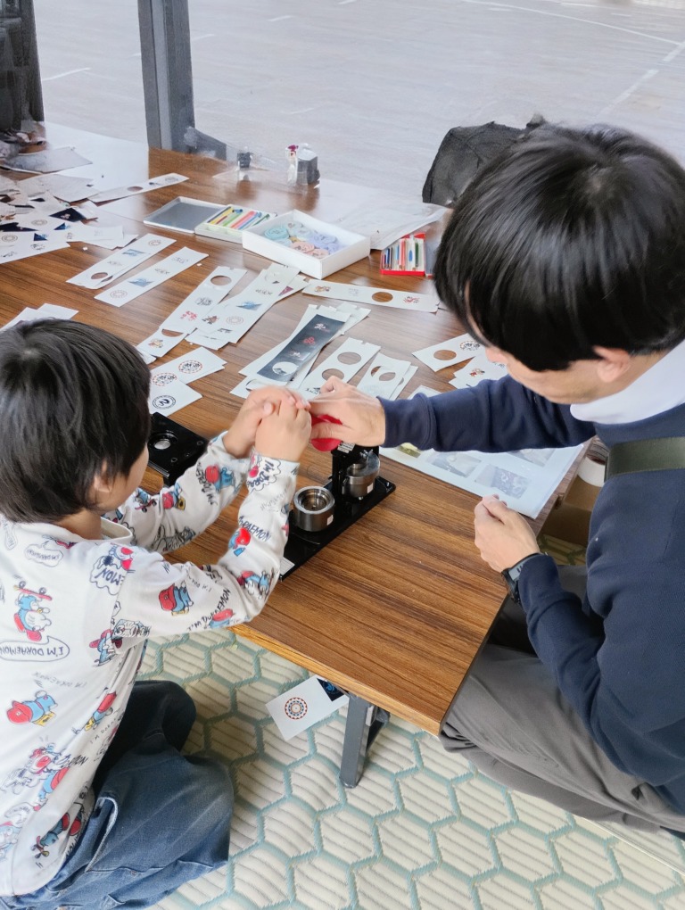 絵柄が出来たら缶バッチの作成体験もさせて頂けて、自分で作った缶バッチに大喜び!洋服につけて自慢気でしたよ。