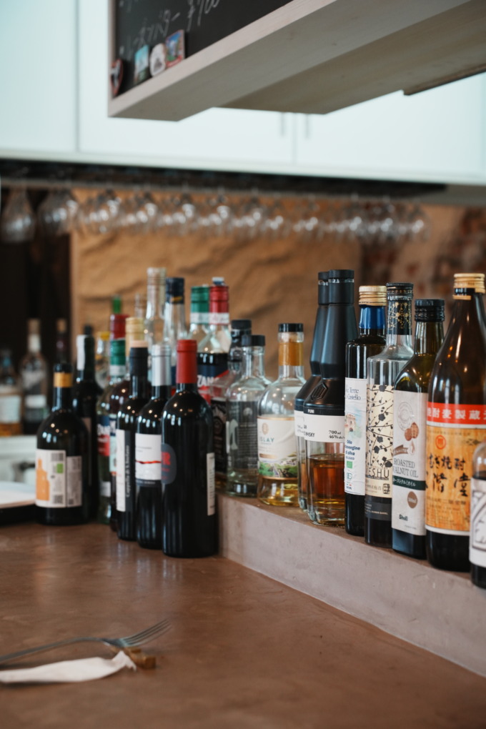 席はベンチシートのテーブルが中心で、カウンター席も用意されています。磨かれた鍋やグラス、ワインボトルが整然と並ぶカウンターを眺めているだけで、料理がやって来るまでの時間がちょっとしたご褒美に。