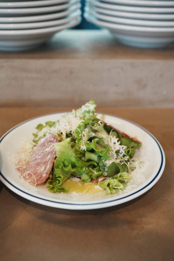 削りたてのチーズがふわっと降り、オリーブオイルの香りとやわらかな酸味のドレッシングが全体を軽やかにまとめます。