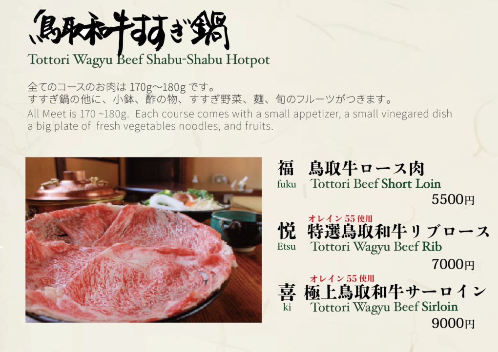 | 価格 | 鳥取和牛すすぎ鍋 5,500円〜 |