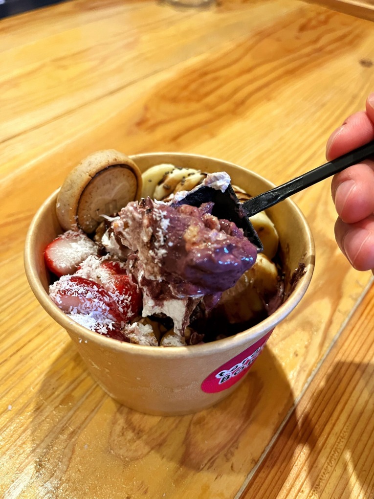 名前の通り、アサイーの表面にパリパリのチョコレートがコーティングされていて、スプーンで割りながら食べるのがめちゃくちゃ楽しい!