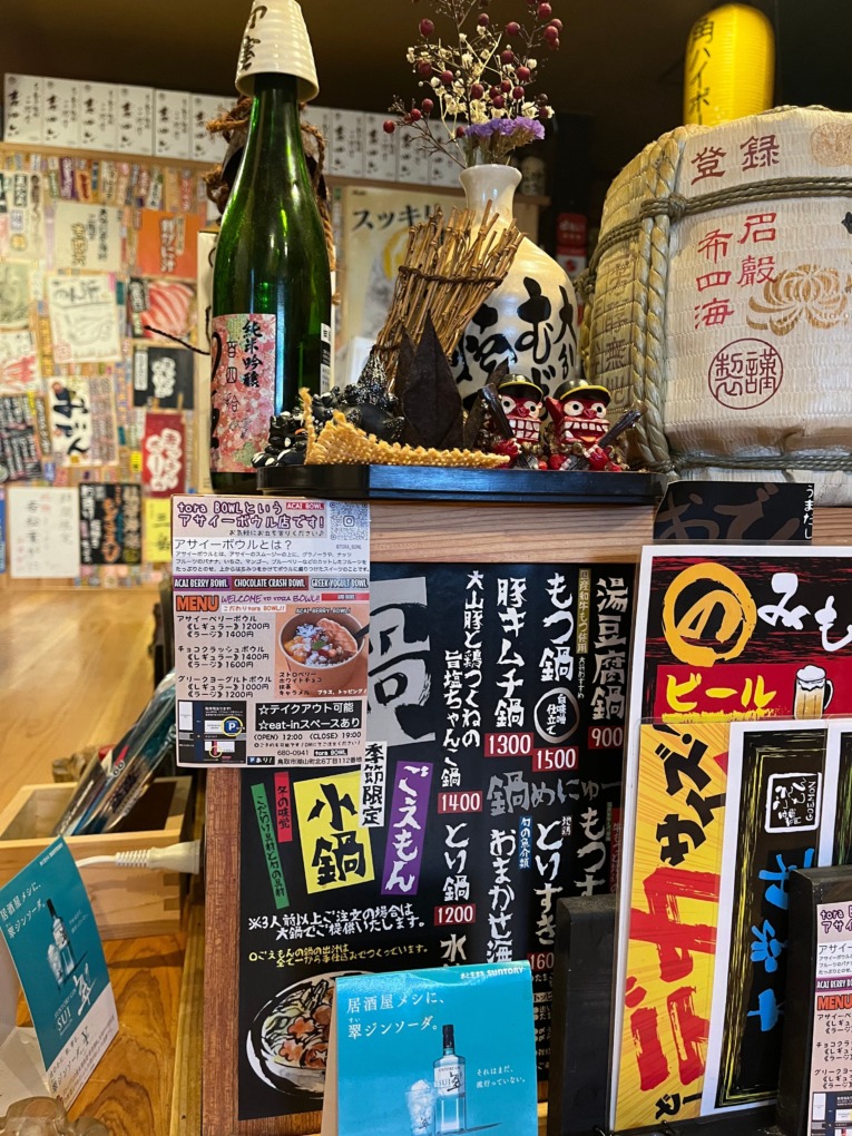 居酒屋さんの一角を利用している形なので、日本酒や焼酎が壁一面に並び、アサイーボウルが出てくるとは想像しにくい内装。
