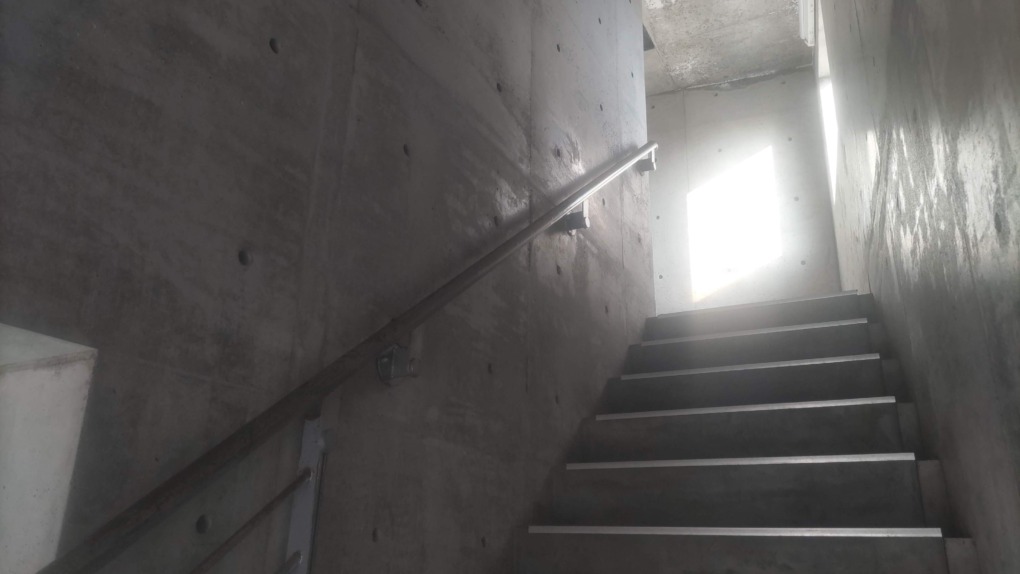 建物の壁にそってコンクリート打ち出しの階段が続きます。