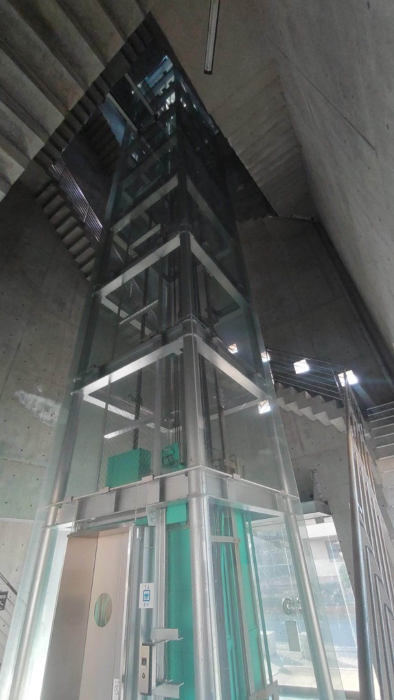 入口から入った内部の様子です。エレベーターを中心にして、階段が建物の壁に沿って二重の螺旋を描くように設置されています。