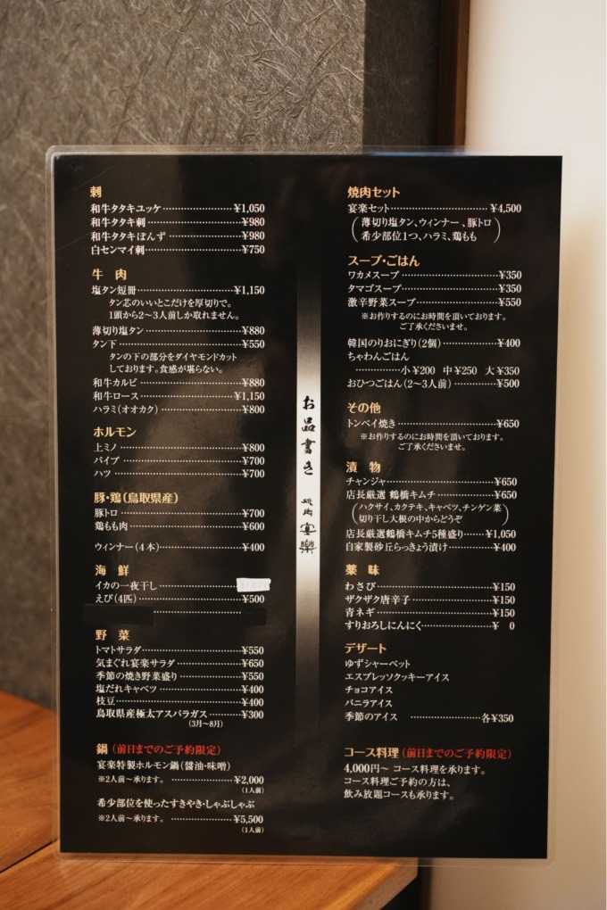 焼肉宴楽の魅力は、なんといっても鳥取和牛を中心とした肉のラインナップです。