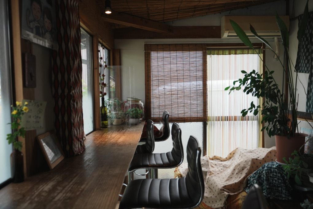 木の温かさが伝わる落ち着いた店内は、カウンター席と座敷席が用意されていて、おひとりさまから友人、ご家族まで幅広く利用できます。窓際には植物や雑貨が飾られ、ゆっくりとした時間の流れる穏やかな空気。