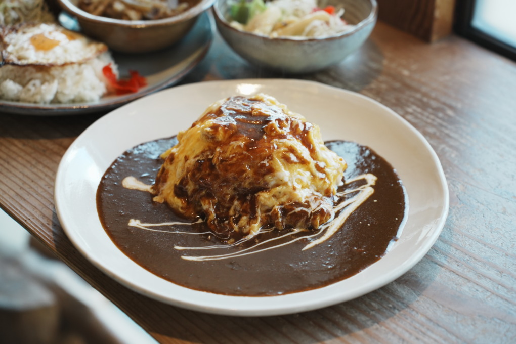 オムカレーは、黒みがかった深い色合いのルーが特徴的。辛さは中辛寄りで、スパイスの香りがほどよく効いた大人な味わいです。ひと口頬張ると、濃厚なコクがふわっと広がり、後からじんわりと辛さが追いかけてきます。上にのった半熟のふんわり玉子と絡めると、まろやかさが加わり、バランスのいい仕上がりに。喫茶店カレーのような懐かしさがありつつ、少し特別感のあるランチでした。