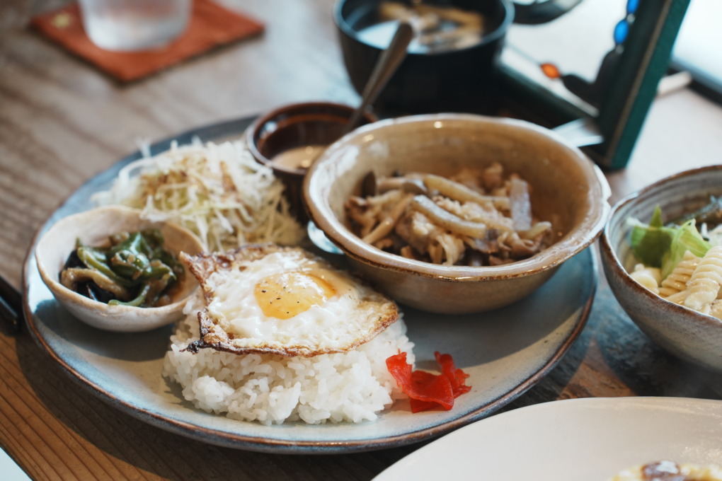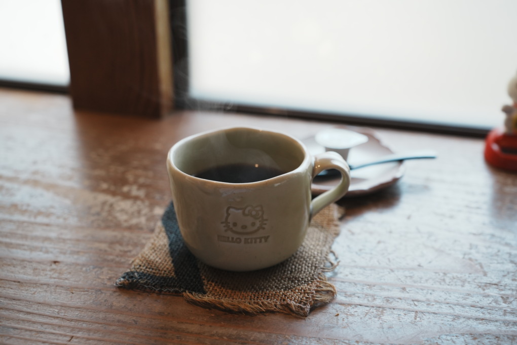 日替わり定食は、小鉢や目玉焼きが添えられた充実の内容。メインのうま煮は、牛肉の旨みにこんにゃくが染み込み、ご飯がどんどん進む味付けです。素朴ながら丁寧に作られていることがしっかり伝わり、毎日食べたいと思える安定のおいしさ。バランスの取れた構成で、野菜をきちんと摂れるところもうれしいポイントです。食後に追加したホットコーヒーは、ほっと一息つける優しい味わい。ハローキティのカップで提供される遊び心ある演出に、思わず笑顔になってしまいました。
