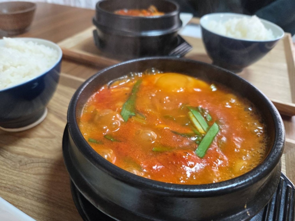 ぐつぐつのスンドゥブチゲを食べながら、