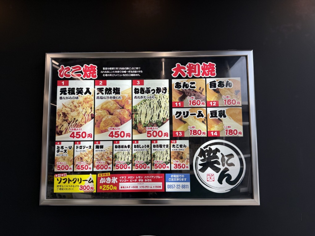 たこ焼きは、定番ソースの「元祖笑人」から「天然塩」、「ねぎぶっかけ」まで。450円〜600円という、このご時世に嬉しい良心価格です。