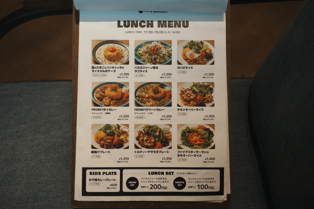 ランチタイム(11:30〜15:00)は、カフェごはんから本格食堂メニューまで充実のラインナップ。人気の「龍のたまごとパンチェッタのライスカルボナーラ」や、「FRUNKグリーンカレー」「ガパオライス」「唐揚げプレート」など、種類豊富にそろっています。